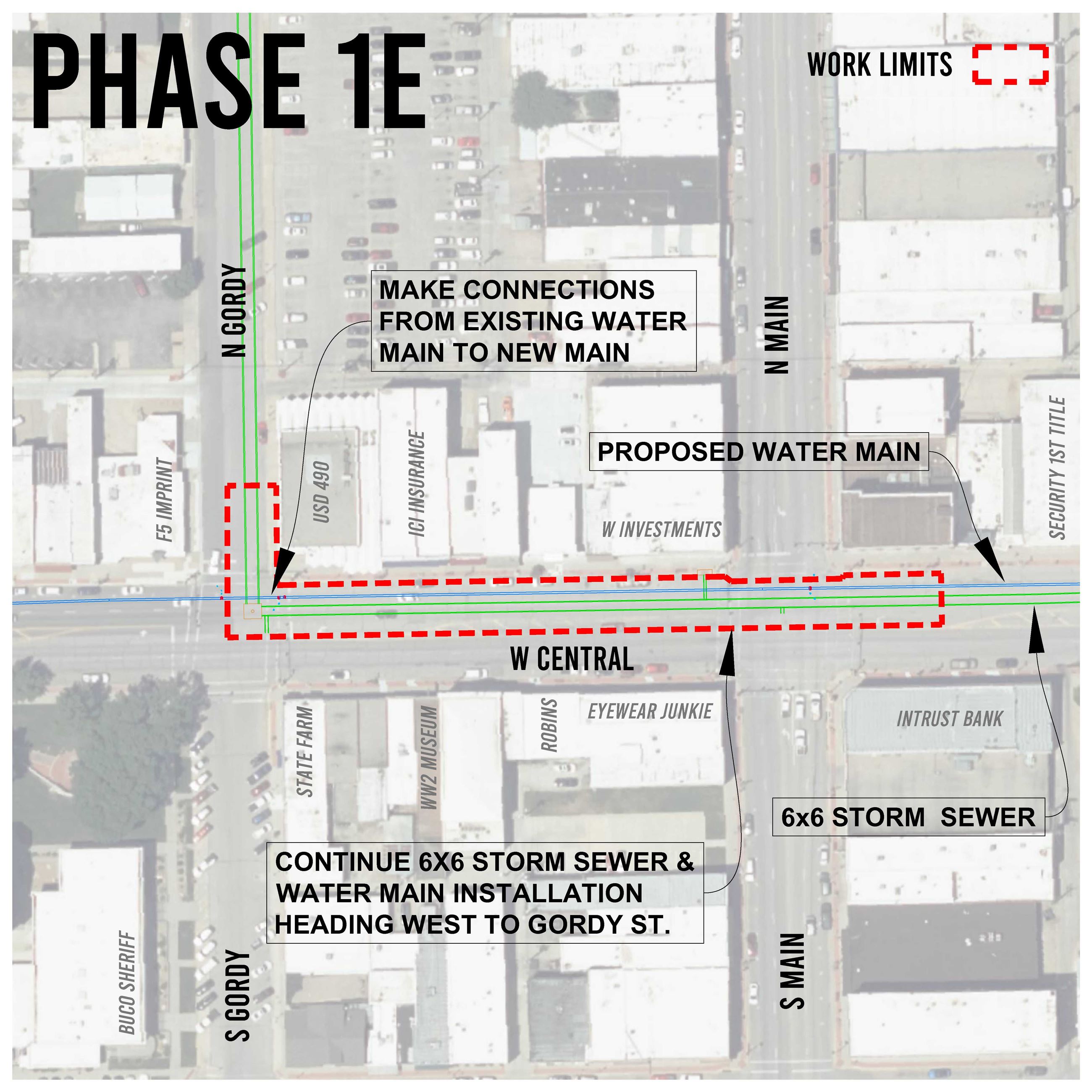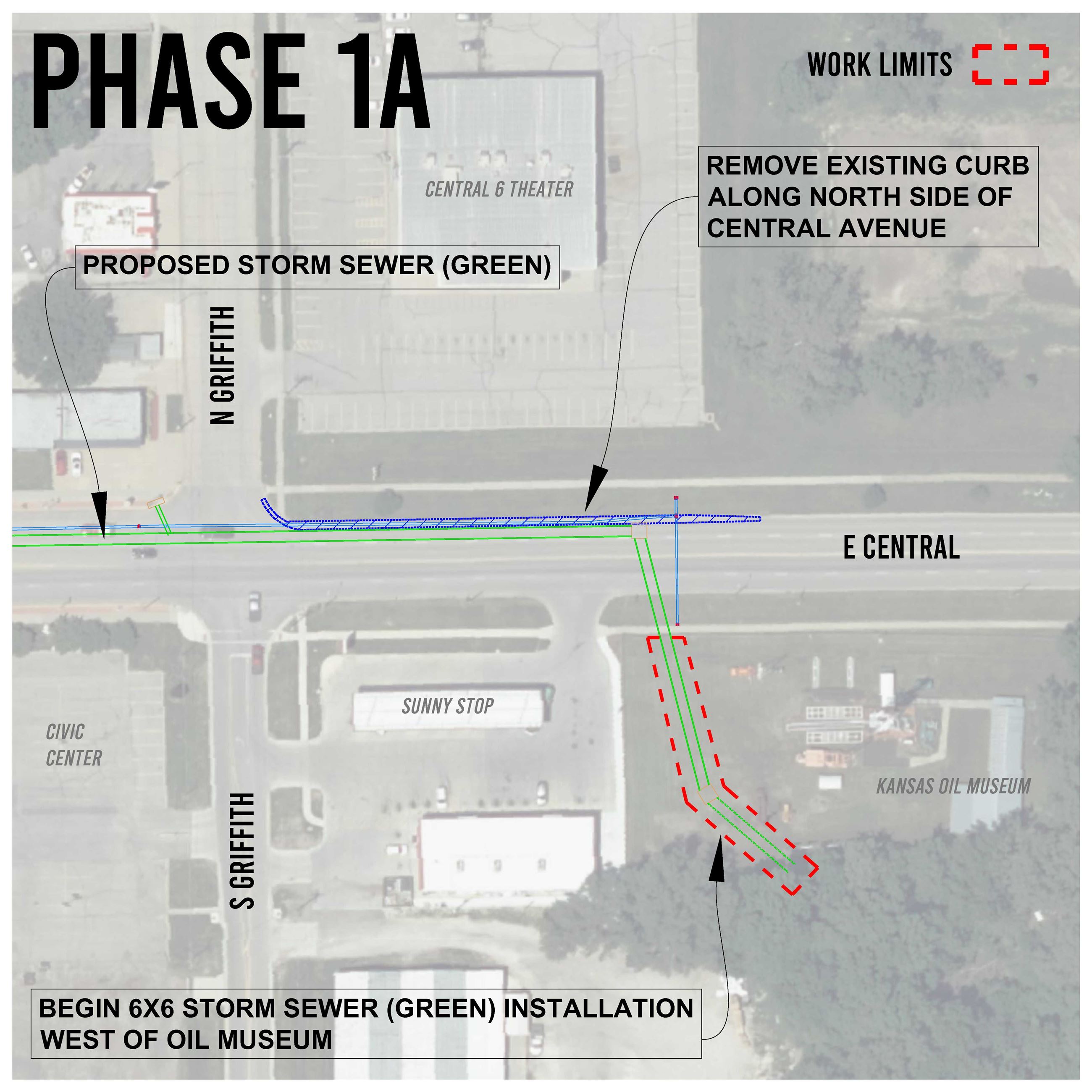Additional Projects: At the same time the improvements for the B.A.S.E. grant are being made the City also will be using a $1 million Kansas Department of Transportation Cost Share Program grant for stormwater improvements to help reduce the potential of street flooding issues in our downtown area, as well as replacing and rehabilitating approximately half a mile of pavements on Central Avenue to address deteriorating pavement conditions. This project includes a 6 foot x 6 foot underground drainage box from Gordy Street to the old Walnut River channel adjacent to the Kansas Oil Museum, as well as placing new drainage boxes on Central Avenue. The proposed Storm Sewer box will reroute a portion of the storm sewer flow from our downtown.