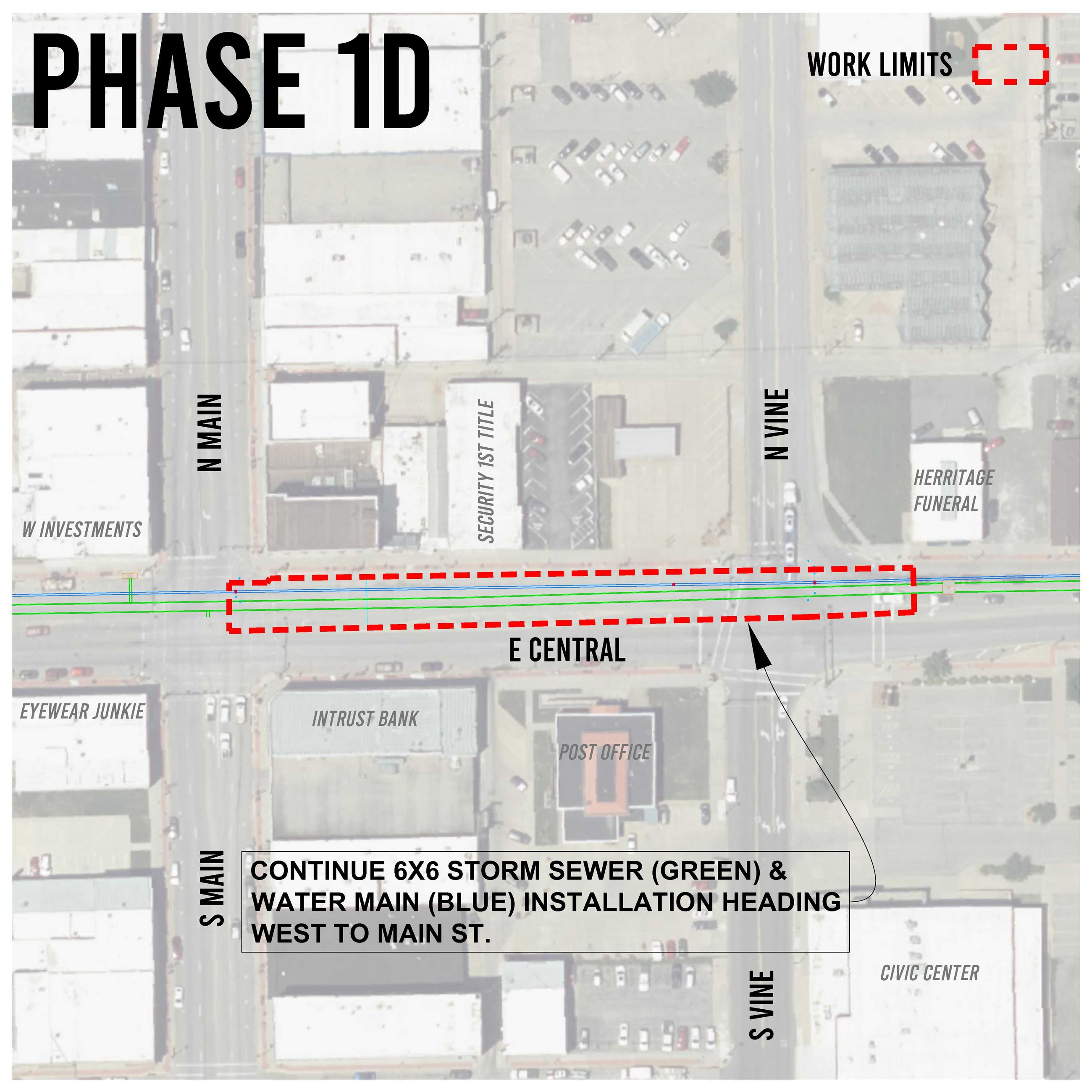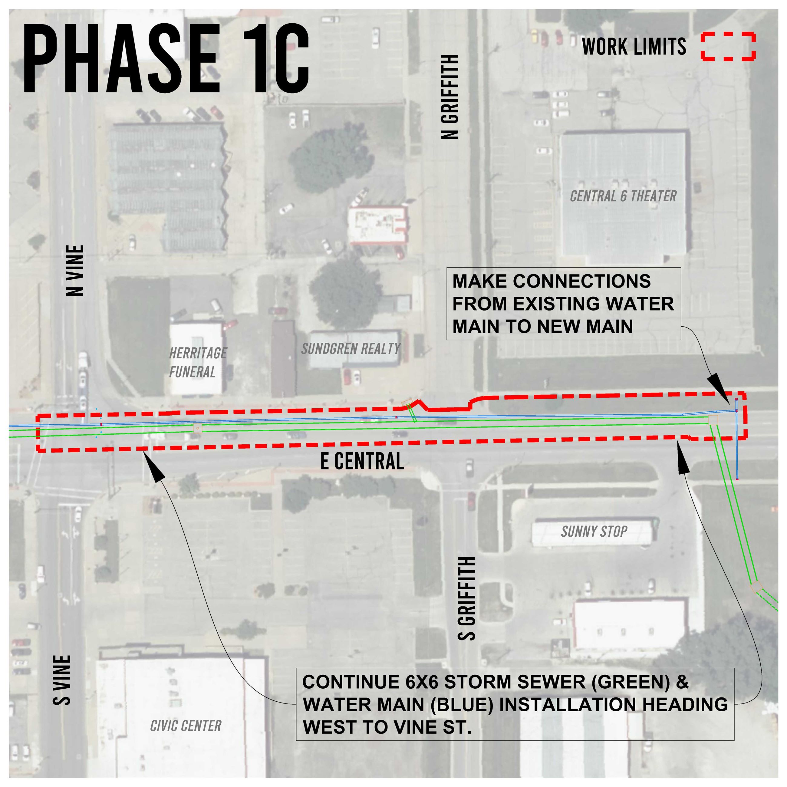October 10, 2024 - The intersection of Main and Central will be closed on the north side. The intersections of Vine and Central and Griffith and Central will reopen.